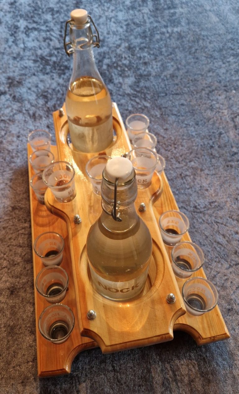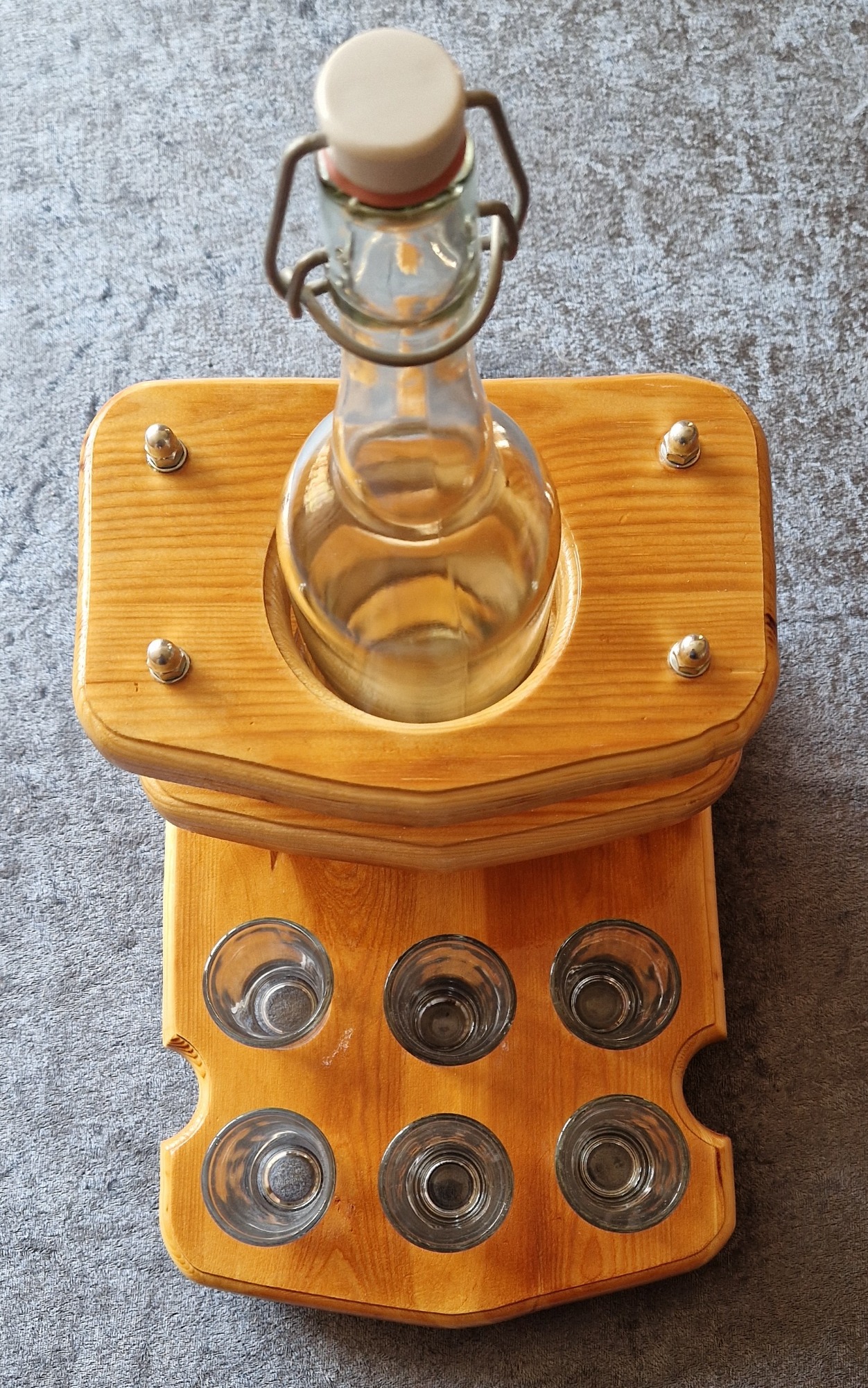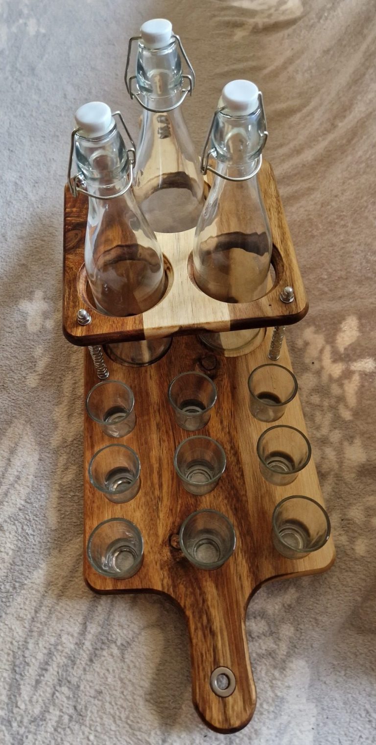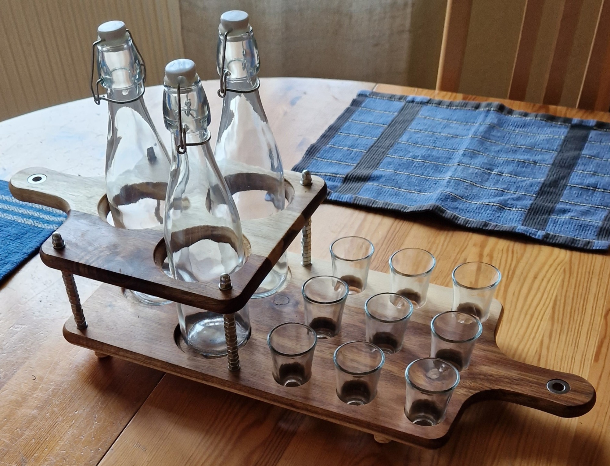 Alla snapsbrickor levereras med flaskor (tomma) och glas.